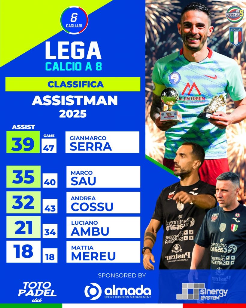 Quinto posto per Mattia Mereu (Luppoli) con 18 assist, numeri che gli sono valsi anche la vittoria della classifica assistman del campionato invernale LegaCalcioa8 24-25.