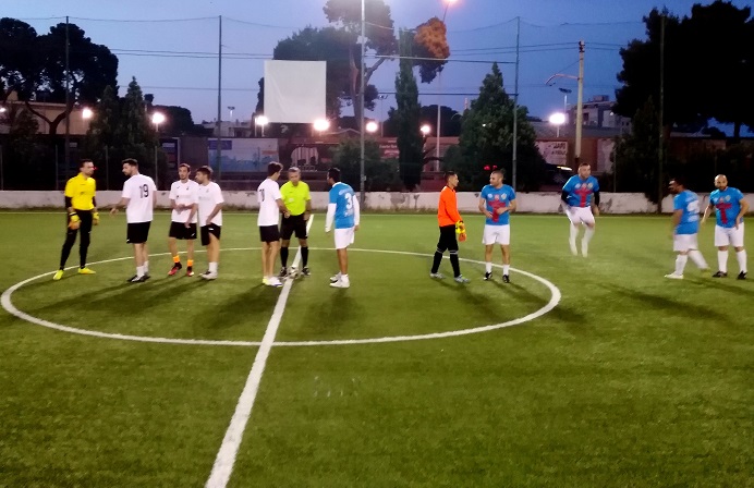 La partita inizia con un brivido per il Pich Team: dopo appena due minuti Agabio sbaglia il rilancio e manda la palla tra i piedi di Locci (6) che tira da fuori area e centra il palo destro. Al ‘7 la Vela Cafè si rende di nuovo pericoloso con Puggioni (10) che sulla trequarti controlla un lancio lungo, avanza con due palleggi e fa partire una gran botta che passa di poco sopra la traversa. Nonostante l’inizio favorevole ai celesti sono i bianchi a passare in vantaggio all’undicesimo con Locci, ma due minuti dopo arriva l’1-1: Puggioni lavora il pallone sulla destra, supera il suo marcatore e dal fondo la passa a Canu (6) che dal limite dell’area tira verso il palo sinistro sul quale è appostato Murgia che da pochi centimetri appoggia la palla in rete.