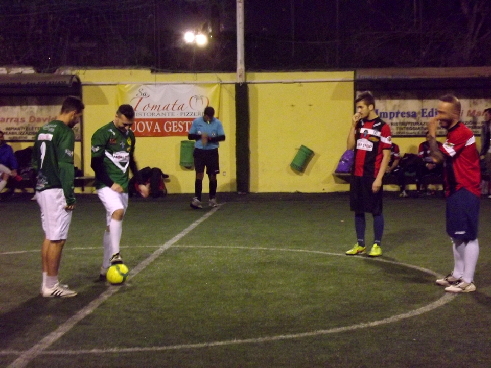 Sono le 20.35 quando il signor Schintu dà il fischio d’avvio alle ostilità, squadre al completo, anche Edil Line, finalmente con due ricambi a disposizione e priva solamente di Xaxa e Fadda, ma con i rientranti Nurchi e Desogus. Avvio tattico, su buoni ritmi, è pero Edil Line a prendere piano piano il controllo del gioco, ci provano Picci su punizione dalla distanza, e quindi Nurchi, con uno spunto in velocità sulla destra, Tradori si fa trovare attento sul primo palo, in corner. Il vantaggio giunge nel calcio d’angolo conseguente, Nurchi appoggia per Cara che incenerisce Tradori e la statica difesa bianco-verde con un preciso rasoterra diagonale dal limite dell’area, sul palo lontano. Pochi minuti dopo i rosso-neri raddoppiano, su un passaggio di Mucelli verso sinistra indirizzato a Mallus, Picci è abilissimo nell’anticipare l’avversario sulla sua metà campo e nel far ripartire l’azione a tutta velocità, il giocatore scende per vie centrali e dal limite dell’area non dà scampo a Tradori, è il 2-0. Difesa granitica e impenetrabile, imperniata sull’asse Picci-Nurchi, intelligente possesso palla, fraseggio, spunti in rapidità con Cara e lo stesso Picci, Edil Line gioca benissimo e legittima il vantaggio, la spinta e la palla sono soprattutto in possesso di West Bromb ma senza alcun esito. Così, Edil Line riesce a rendersi ancora pericolosissima, Tradori dice no a Cara, su bellissimo duetto con Nurchi, poi è determinante una murata difensiva di Mucelli su botta di Picci dal limite dell’area diretta in porta. Il 3-0 è nell’aria, Desogus sulla destra scatta un paio di metri e insacca con un diagonale diretto sul palo lontano, da fuori area. Non c’è storia, West Bromb arranca, fatica a costruire e a rendersi insidiosa e dietro patisce le pene dell’inferno, una strepitosa Edil Line pare avere il fuoco acceso negli occhi, i rossoneri potrebbero dilagare ma Tradori compie una prodezza decisiva sullo scatenato Picci, autore di un discesa a campo aperto. La prima vera grande occasione per West Bromb giunge al quindicesimo minuto, su filtrante di Frau in profondità, centralmente, Schirru si trova a tu per tu con Cappai ma gli spara la palla addosso, da ottima posizione. Sul rovesciamento di fronte, Edil Line nuovamente vicina al poker, Picci pesca Nurchi dalla propria tre quarti con un filtro straordinario, e il numero 20 trova un grande Tradori a negargli il gol, l’azione però prosegue, irrompe Desogus che calcia da fuori area un sinistro angolatissimo, Tradori in tuffo devia in corner. Con un Picci immenso e a tutto campo, Edil Line colleziona occasioni e potrebbe davvero dilagare, West Bromb non c’è, solamente qualche tiro dalla distanza, telefonato e forzato, i bianco-verdi provano a sfondare dalla corsia di destra, Schirru è mobile e attivo ma sotto porta qualcosa non funziona, Schirru mette al centro una palla golosa per Aramo che cicca incredibilmente la battuta da soli quattro metri. Poco dopo, autentico miracolo di Tradori sullo sprecone Pinna, liberato tutto solo davanti al portiere avversario da una bellissima ripartenza del solito Picci, imbattibile negli anticipi. Il forcing tentato da West Bromb appare confuso e frenetico, senza tante idee, la difesa e la copertura opposte da Edil Line sono impeccabili, ma allo scadere la capolista riaccende la speranza riducendo il passivo, Aramo trova un corridoio aperto dalla destra, si accentra e da fuori area sorprende Cappai con un colpo d’esterno destro diretto all’incrocio dei pali.