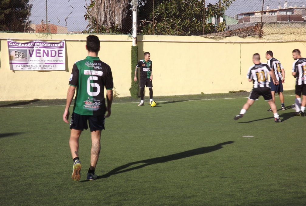 Go Go Bar 2 è senza i soli Loi e Arisci, mentre Sisal Pay rinuncia ad Ascenzi, Bolognesi, Uras, Pontis e Angioni, tra i pali gioca Tradori, con Olla giocatore di movimento. Pronti via e dopo circa un minuto e mezzo Go Go Bar 2 passa in vantaggio, Secci appoggia sulla destra per Ambu, questi taglia verso il centro vincendo un contrasto con Olla, la palla finisce a Frau che dalla sinistra, indisturbato, controlla e batte Tradori. Sisal Pay reagisce e prova a mettere in difficoltà i nero-verdi con improvvise sortite in velocità, ci prova Olla sulla sinistra ma il palo esterno e Cappai gli dicono no. Go Go Bar 2 tiene sempre elevata la pressione, giocando spesso di prima con scambi e azioni specie sugli esterni, dove agiscono Secci sulla sinistra e Ambu sulla destra. Frau va vicino al 2-0, prima colpendo un palo con una percussione sulla fascia sinistra, e quindi imbattendosi nell’ottimo Tradori, sugli sviluppi di uno sciagurato retro-passaggio di Cortis, poi ancora Tradori salva su rasoterra di Boi da fuori area. Sisal Pay soffre e colleziona troppi errori sia dietro e sia davanti, la partita pare essere nettamente in mano a Go Go Bar, su lancio lungo di Boi, Ambu controlla in corsa tagliando verso destr ma la sua conclusione dal limite dell’area si stampa sul palo. A sorpresa, nella successiva azione sul fronte opposto, giunge il pari di Sisal Pay, Schirru scarica una violenta conclusione da fuori area, da destra, Cappai non trattiene, forse tradito da una strana traiettoria assunta dalla palla, Tocco irrompe e ribadisce in rete. Dura un nulla la parità perché Go Go Bar ritorna subito in vantaggio, grande azione personale di Secci che dalla destra si accentra e serve in diagonale verso sinistra Frau, abile nell’eludere il controllo degli spaesati difensori bianco-neri e pronto nel superare da posizione ravvicinata Tradori, poco reattivo. Botta e risposta, Sisal Pay trova il 2-2 un paio di minuti più tardi, Piras pennella una palla alta da metà campo, Tocco sfugge a Corongiu e batte con una mezza girata di sinistro dal limite dell’area Cappai, uscito in ritardo e apparso incerto, a metà strada. La partita tende a farsi più equilibrata, Sisal Pay dà segnali di crescita e pare prendere più iniziativa e campo, incisiva nel gioco di rimessa sull’asse Schirru-Tocco-Olla, ma soprattutto è più determinata e grintosa, Go Go Bar è opaca, quasi indolente, svogliata, la pressione è sterile e i ritmi restano bassi. Ma allo scadere dei primi venticinque minuti, i nero-verdi rimettono il muso avanti, da sinistra verso destra, in diagonale, Serra-Secci-Corongiu, diagonale di quest’ultimo dal limite dell’area, Tradori non trattiene e Serra è rapido nel ribadire in rete sotto porta, nonostante il disperato tentativo di salvataggio di Schirru.