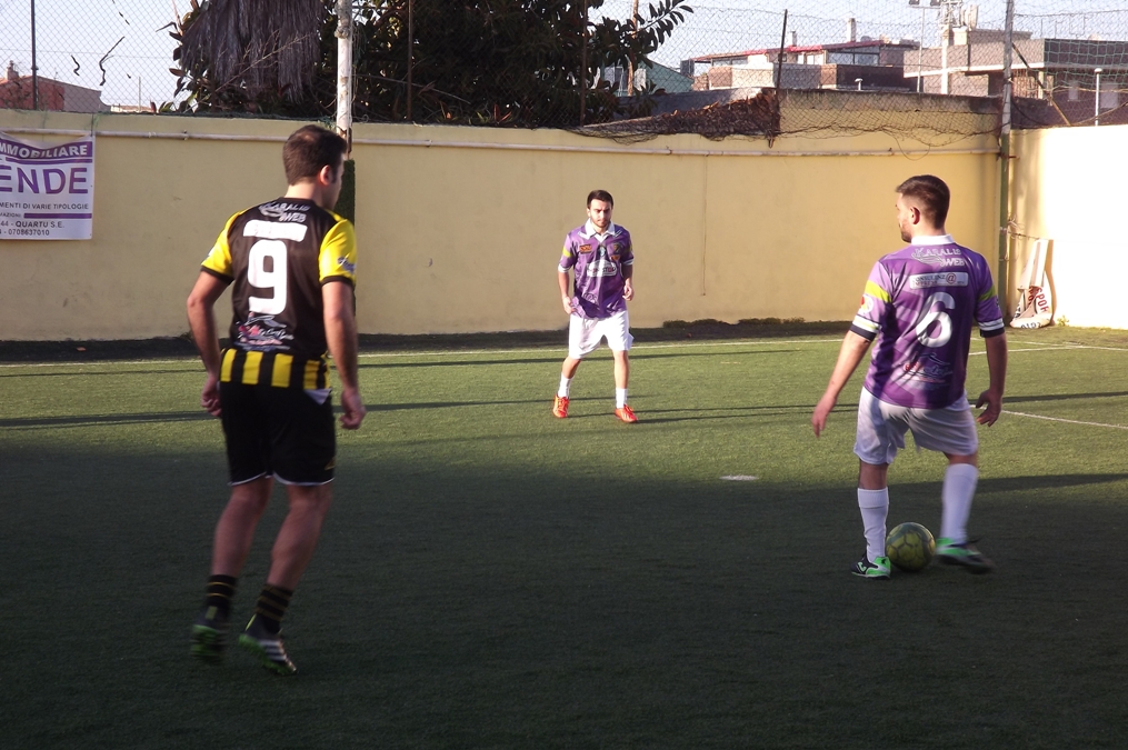 Con tanti spazi e squadre lunghissime, e conseguenti continui rovesciamenti di fronte, fioccano le occasioni per ambo le due compagni, anche perché a centrocampo si spalancano voragini; sull’asse Vargiu-Ligas-Cipriani, Malagana mantiene costante la pressione offensiva, Cipriani tenta di approfittare di un’incomprensione tra Cogotti e Pusceddu, allunga il piede ma ha la sfortuna di trovare il palo a dirgli no; sul ribaltamento di fronte, la Real Pachuka attua un contropiede tre contro uno, ma Carboni eccede nell’altruismo e invece di calciare da buona posizione, sulla destra, chiude il triangolo con Ragatzu ma il passaggio è fuori misura e l’occasione va a fondo. Gol sbagliato gol subito, non sbaglia Vargiu, lesto nel soffiare palla a metà campo allo svagato Carboni e nel trafiggere Pusceddu con un destro rasoterra dal limite dell’area. Gara che, seppur chiusa sul piano del risultato, si mantiene vivace e giocata su buoni rimi, Novin colpisce un palo, la Real Pachuka è generosa e i due attaccanti sono abbastanza mobili ma sotto rete pare esserci un sortilegio, Ragatzu va via sulla destra, crossa basso, Obino respinge con il piede, Carboni irrompe per ribadire in rete a botta sicura ma Oliviero si immola murando la conclusione. Imperdonabile qualche minuto dopo un’altra grande palla gol sprecata da Ragatzu, in contropiede con Carboni e per giunta in superiorità numerica, il giocatore ex Autocarrozzeria Solla manda a lato dalla destra, solissimo. In questo continuo e frenetico ping-pong, Malagana concede parecchio dietro ma attacca e si porta sul 6-0, sicuramente più cinica e più concreta in fase realizzativa, Pau effettua una chiusura a metà campo, serve Ligas che verticalizza per Cipriani il quale centra il bersaglio dal limite dell’area. La Real Pachuka pare ormai non avere più benzina né motivazioni, ma nel finale i viola hanno comunque il merito di costruire l’azione più bella di tutta la partita, una combinazione tutta di prima sul settore offensivo di sinistra Cogotti-Saias-Ragatzu-Pinna, con quest’ultimo atterrato al limite dell’area; essendo il sesto fallo subito, il team di Cogotti può usufruire di un tiro libero, ma Ragatzu si fa parare la battuta da Obino. Malagana, forte del 6-0, conclude in attacco e legittima il cospicuo vantaggio creando tante altre occasioni, Cipriani colpisce per la seconda volta il palo e infine Pusceddu nega a Vargiu il possibile settimo gol su un diagonale da sinistra abbastanza insidioso.