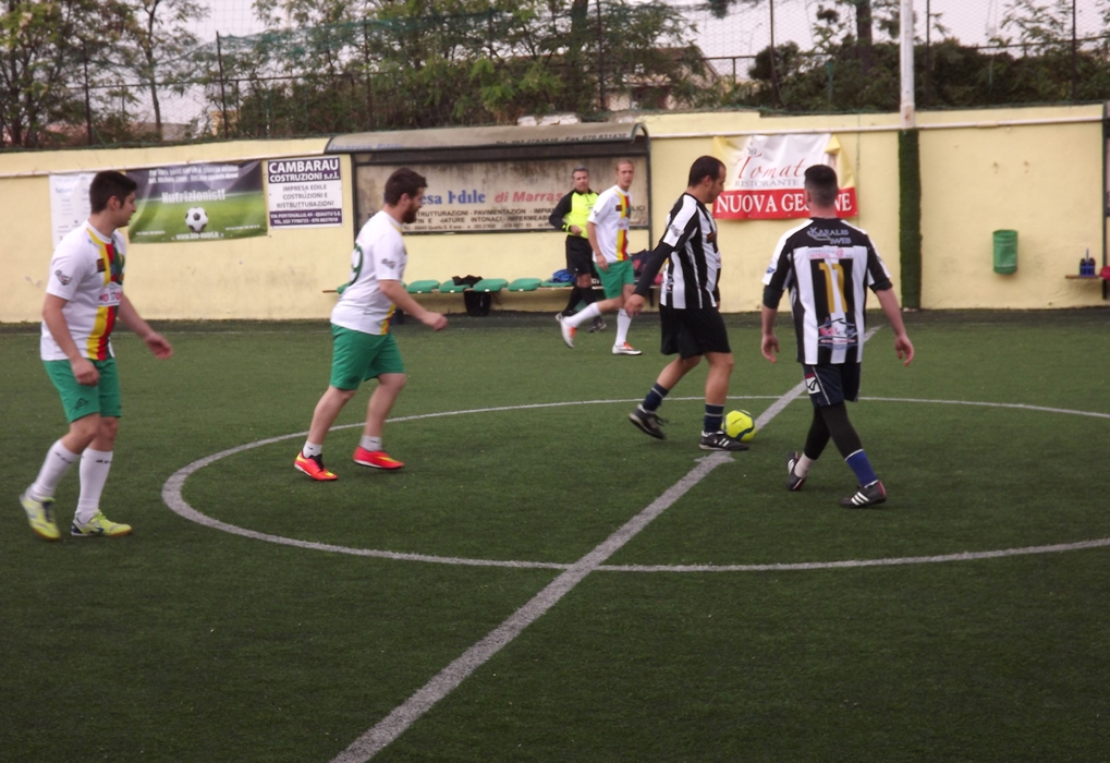 La New Team è senza Zucca e in attesa di Pinna nel primo tempo in porta ci va Frau, Sisal Pay invece rinuncia ai vari Uras, Zuncheddu, Piras, Angioni e l’infortunato Tradori, Olla è il portiere, dirige il signor Piga. Primi minuti all’insegna dell’equilibrio, ma il punteggio iniziale è infranto dal gol del vantaggio della New Team, Persson converge da sinistra al centro e lascia partire un rasoterra da fuori area non irresistibile, Olla però pasticcia, la palla gli sfugge dalla mano e rotola nel sacco. I bianco-verdi prendono presto il netto controllo delle operazioni e sfiorano il raddoppio in diverse circostanze, un diagonale di Perra termina a lato di due metri e poi Olla respinge in corner una sassata di Festa diretta sotto la traversa. Una ghiottissima occasione per portarsi sul 2-0 capita poco dopo, un contropiede tre contro uno avviato da Festa sugli sviluppi di una palla persa da Cortis, Durzu riceve sulla sinistra e deve solo appoggiare la palla in porta ma il giocatore riesce nell’impresa di colpire il palo, con Olla ormai superato. Festa gestisce male poi un’altra buona occasione quindi anche la sfortuna mette i bastoni tra le ruote alla New Team perché un destro da fuori area di Perra si stampa all’incrocio dei pali. Una Sisal Pay fino a quel momento assente ingiustificata agguanta il pareggio al primo vero affondo, Schirru chiama in causa Frau con una bella conclusione di sinistro da fuori area, e nell’azione successiva Tocco realizza l’1-1 al termine di un magistrale contropiede condotto con Ascenzi, difesa bianco-verde completamente sbilanciata. Il copione tattico resta invariato, è sempre la New Team a esercitare una costante e intensa pressione, Sisal Pay sbaglia tanto e arranca ma i bianco-neri hanno in contropiede la grande chance di passare in vantaggio, tre contro uno, Tocco però gestisce male l’ultimo passaggio; non si contano i disimpegni e gli appoggi errati, e ne risulta di conseguenza uno spettacolo indecente, la New Team macina tanto e spinge sull’asse Perra-Festa-Mallus, apparendo di gran lunga superiore su tutti gli aspetti ma i bianco-verdi non trovano il colpo risolutore.
