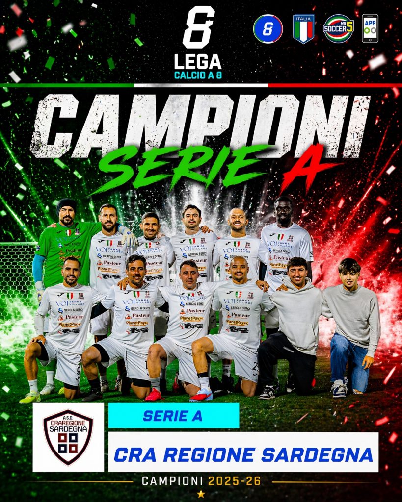 Non servono stadi da centomila posti o riflettori accecanti per scrivere la storia di un campionato: a volte basta semplicemente un campo, un pallone e un gruppo di amici con voglia e grinta. Ogni battaglia, ogni difficoltà, ogni incertezza… Poi i sorrisi stanchi, le urla liberatorie… E alla fine, ecco lo scudetto: CraRegione vince la Serie A 2025-26 della Legacalcioa8 Sardegna divisione Cagliari. Il quarto di fila se contiamo quelli degli invernali passati, quando il gruppo si chiamava “360GG”. Quest’anno, ben più sudato della scorsa annata. Ma la squadra di quell’uomo da tanto genio e sregolatezza allo stesso tempo, Nicola Scarlatella, l’ha avuta vinta anche stavolta. Sole due sconfitte in 17 partite giocate (aggiornati al 25/04/2026) arrivate entrambe a novembre. Da lì, solo vittorie, ben 14, e un solo pareggio.