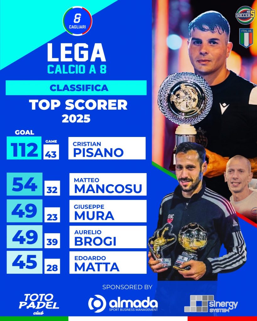 In prima posizione, con un netto distacco sugli altri, un giocatore che ormai non ha più bisogno di particolari presentazioni: Cristian Pisano. 48 partite disputate tra Cagliari League e campionati di Calcio a 8 (Serie A, Serie B e Over35), 112 gol segnati. Molti di questi sono stati segnati con la maglia di FC Incendiati in cui, specialmente nella prima parte dell’anno, ha trascinato questi ultimi. A partire dal 3° campionato LegaCalcioa8 in cui gli Incendiati hanno chiuso al terzo posto in Serie A e in semifinale nella Champions Cup. Ancora meglio nel 4° Torneo Summer, in cui è stato capocannoniere della prima fase Open (14 reti in 5 partite), e ha trascinato i suoi alla vittoria finale della categoria (3-2 contro CraRegione in finale). Le cifre più clamorose però arrivano nell’Over35 in cui, con la maglia di Quattroemme, Cristian ha totalizzato 51 gol in 19 presenze (media di più di 2 gol a partita). Fine di 2025 un po’ sottotono invece, ma l’apporto con tutte le maglie in cui gioca non è mai mancato e non mancherà mai.